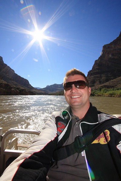 Der Tag war dann doch nicht so anstrengend, wie ursprünglich angenommen. Nachdem ich um 6 a.m. von King Airlines am Flamingo abgeholt wurde, startete die Einmotorige Propellormaschine um 8 a.m. zum Grand Canyon West. Von dort wurde meine Reisegruppe, die mit 4 Leuten recht überschaubar war – es waren 3 ältere UK’ler dabei – mit dem Heli ins Tal zum Colorado River geflogen. Sehr beeindruckend, wenn man dieses Wunderwerk der Natur betrachtet!!!! Auf dem Colorado River wurden wir mit einem kleinen Motorboot eine Meile Flußaufwärts gefahren und liesen uns zum Ausgangspunkt zurücktreiben. Yeah! Ich war auf dem Colorado River – glaubs selbst noch gar nicht so 🙂